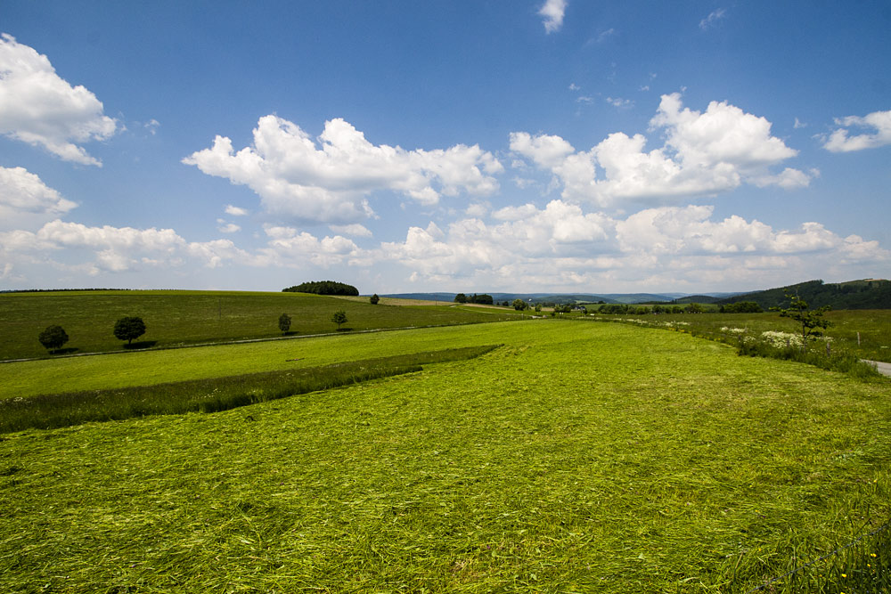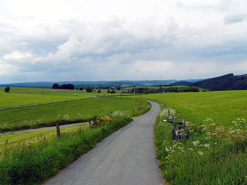 Der Weg führt zunächst vorbei an Häusern, hinunter zur Eder. Jetzt steigt der asphaltierte Wirtschaftsweg leicht an, eine 90 Grad Linkskurve, vorbei an einer Feldscheune, dann folgt eine 90 Grad Rechtskurve. Fahren Sie vor bis zum Waldrand. Jetzt heisst es aufpassen und keinen falschen Weg nehmen. Sie müssen links hoch, der Belag wird holpriger und dieser Weg führt am Waldrand entlang. Nach einiger zeit wird der Anstieg flacher und Sie sehen auf der linken Seite einen Hof. Danach gibt es einen heftigen kurzen Anstieg, der Belag wird deutlich besser. Jetzt fahren Sie oberhalb von Hemschlar durch die Felder und Wiesen. Fahren Sie vor, bis Sie die K 45 erreichen. Diese überqueren Sie und folgen dem Weg hinauf zum Wald. Vom Waldrand haben Sie eine schöne Aussicht zurück auf die Wittgensteiner Hügel.