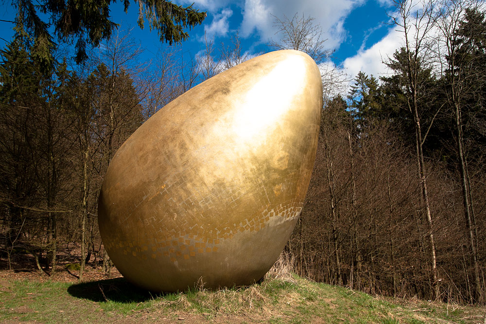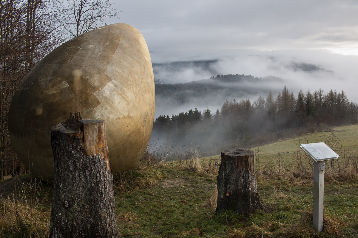 Am Ende der Strecke befindet sich ein Holzsammelplatz, die Wege verzweigen sich. Sie fahren hier die scharfe Rechtskehre. es geht jetzt bergan. Nach einigen Kurven erreichen Sie die Anhöhe am Trufterhain. Blicken Sie nach links, dort sehen Sie am Waldrand das Goldene Ei. Wenn Sie noch etwas Power haben dann machen Sie den kleinen Abstecher. Anschließend können Sie den Hinweisschildern "Hof Mühlbach" folgen. Hier ist der richtige Ort, um die heutige Tour mit einem guten Bier oder gemütlichem Abendessen ausklingen zu lassen. Vorbei am "Hof Mühlbach" führt unsere Route durch den Eichenweg und durch die Berleburger Altstadt zurück zum Ausgangspunkt.