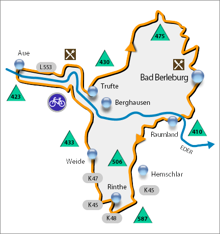 In Rinthe Ortsmitte mündet die K 48 in die K 45. Sie fahren hier links. Es geht bergab, ungefähr 500m hinter Rinthe fahren Sie wieder rechts ab auf die K 47 Richtung Weide, Berghausen. Eine ruhige und schöne Strecke liegt vor Ihnen, meist führt die Straße leicht bergab. Vorbei an den Häusern von Weide fahren Sie Richtung Berghausen. nach einiger Zeit erreichen Sie wieder das Edertal. Sobald Sie den Bahnübergang der Rothaarbahn erreicht haben, halten Sie anschließend auf der linken Seite Ausschau nach dem Schild "EAW" bzw. Aue, Ederauen-Radweg.