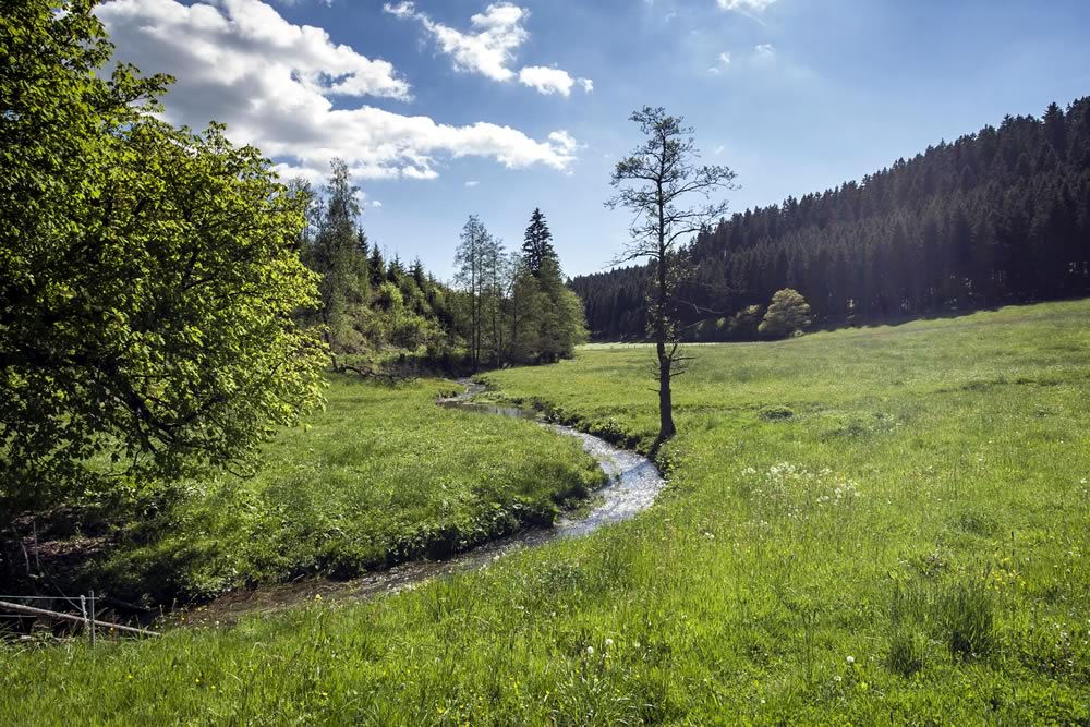 Die kurze erste Passage ist dieselbe wie bei Tour Eins. Daher finden Sie hier bis Raumland Sportplatz eine identische Beschreibung. Das liegt nicht etwa an der Einfallslosigkeit des Autors, sondern ergibt sich aus der geografischen Lage Bad Berleburgs. Hier an der Mündung der Odeborn in die Eder ist das Tal relativ schmal. Zu der vielbefahrenen Bundesstraße gibt es für Radfahrer nicht allzu viele Alternativen, bzw. diese Alternativen sind wiederum Straßenfahrten oder zum Teil kräftige Anstiege. Wir wollen aber unsere Tour nicht schon mit schweiss treibendem Einsatz beginnen. Die beschriebene Wurzelpassage ist meiner Meinung nach die beste Alternative.