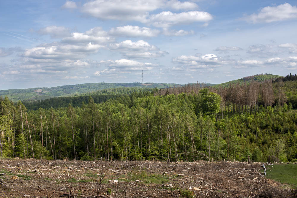 Dieser Weg führt zunächst durch Fichtenholz, weiter oben überwiegen Buchen. Hier oben mündet dieser Wirtschaftsweg in einen Hauptforstweg. Links sehen Sie Lärchenholz, rechts und geradeaus überwiegen wieder die Fichten. Sie fahren hier links, nach 50 Metern sehen Sie rechts eine größere Lichtung mit Viehweiden. Der Weg verläuft relativ gerade, dann ein kurzer Anstieg, an der Weggabelung radeln Sie links weiter.