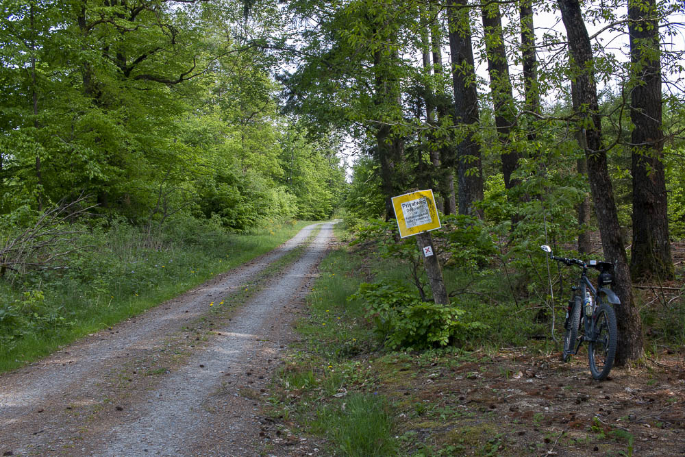 Hier geht es dann links ab zunächst fahren Sie am Waldrand entlang, bis der flach verlaufende Weg in den Wald führt. Nach ca 200m verlassen Sie diesen Hauptweg, Sie biegen rechts ab. Dieser Forstweg führt zunächst steil bergan. nach einer Weile wird der Anstieg flacher. Im kleinen Gang folgen Sie den Windungen dieses einsamen aber gut fahrbaren Forstweges. Wichtig ist, dass Sie immer auf diesem Hauptweg bleiben und kleinere Abzweige einfach ignorieren.