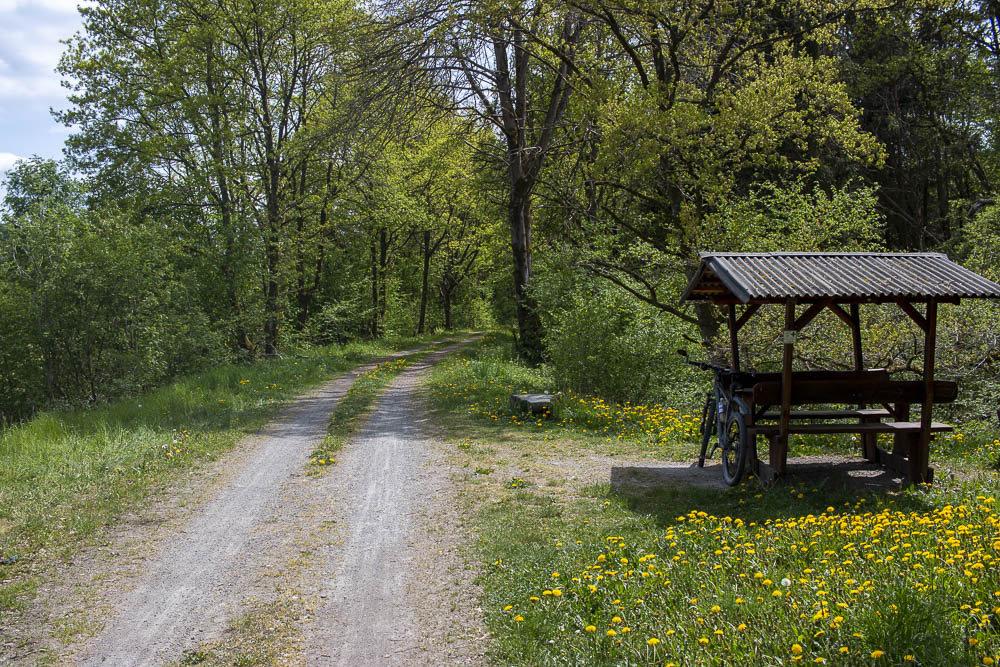 Am Lausfeld trifft unsere heutige Route auf die K 112. Wir überqueren die kleine Straße. es geht etwas steiler bergan auf der holprigen Piste bevor ein kleiner Downhill Sie bis zum Fuße der Sackpfeife kräftig durchschüttelt