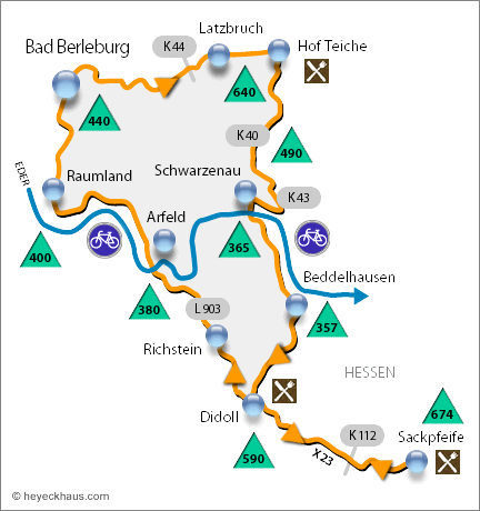 Die Rückfahrt führt wieder über dieselbe Route "X 23" bis zum Berggasthof Didoll. Von hier fahren Sie aber die L 903 hinunter nach Richstein. Ihre Bremsen sollten gut justiert sein, es geht hurtig abwärts. Den Ort Richstein durchqueren Sie und es geht immer leicht bergab weiter bis Arfeld. (unterwegs gibt es zwei Möglichkeiten - folgen Sie der Ausschilderung "Dotzlar").