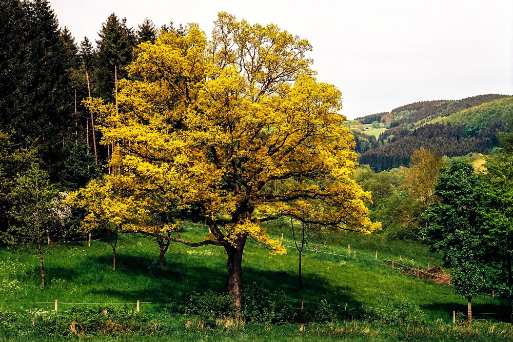 Zwei Kilometer hinter Wemlighausen am ausgeschilderten Parkplatz "Winterbach" können Sie mit einem kurzen Abstecher einen sehr seltenen Baum in Augenschein nehmen. Fahren Sie hier links den Wirtschaftsweg hinab, ungefähr 70 Meter weiter am Ferienhäuschen "Goldeiche" rechts einbiegen, kurz darauf sehen Sie links am Waldrand die Goldeiche (Quercus robur Concordia). Sie ist eine Kulturform der Stieleiche. Es gibt nur sehr wenige Bäume, nach anderen Quellen drei oder fünf, auf der ganzen Erde. Ein Exemplar steht hier im kleinen Rüsselsbachtal.