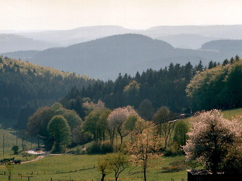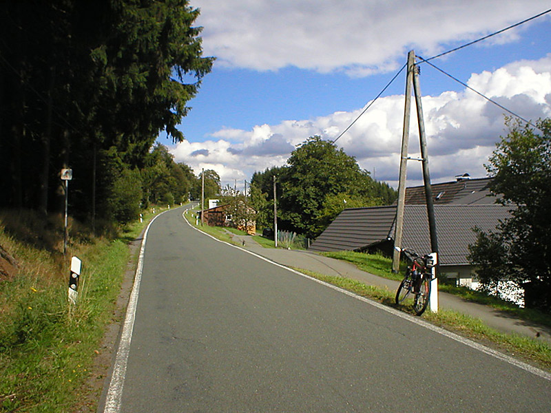 Eine gut ausgebaute Straße führt Sie hinaus aus dem Ort, es geht immer leicht bergan durch die schöne Wittgensteiner Landschaft. Die Straße ist relativ wenig befahren und übersichtlich. Nach 4-5 Kilometern mehr oder weniger gemächlichem Berganfahren wird es nach einer scharfen rechts-links-Kurve richtig bergig.