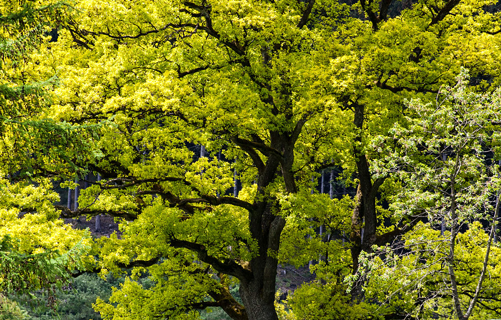 Die Blätter der Goldeiche treiben ab Mitte Mai goldgelb aus. Dieses Naturereignis lässt sich aber nur drei bis vier Wochen lang beobachten Die Gründe für die außergewöhnliche Laubfärbung sind bisher noch nicht hinreichend erforscht. Im Sommer verfärben sich die Blätter gelblichgrün.