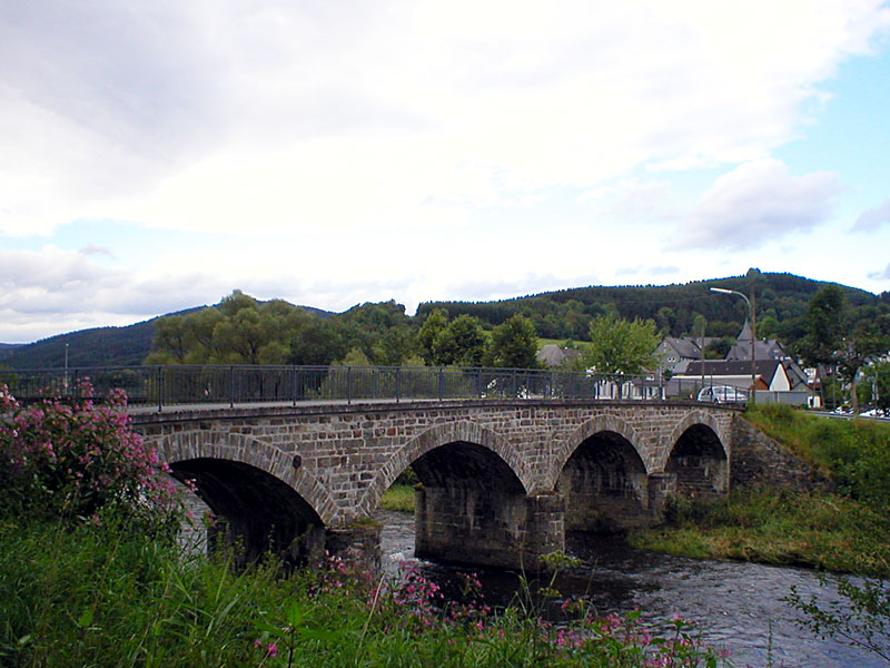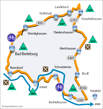 Kurz vor Raumland geht es links über die Ederbrücke und dann durch den Ort. Beachten Sie die schöne alte Kirche. Alles ist bestens ausgeschildert. Es geht hinaus aus dem Dorf, über die alte Brücke. Wer die heutige Tour mit einer Einkehr abschliessen will, fährt hinter der Brücke links bis zum Hotel Raumland (Hinweistafel beachten). Ansonsten fahren Sie rechts ab auf die B 480. In wenigen Minuten sind Sie wieder in Bad Berleburg.