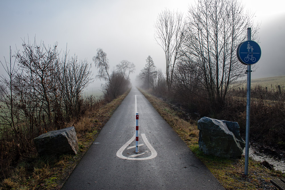 Der Ederauenradweg bei Beddelhausen an der Landesgrenze zu Hessen im morgendlichen Novembernebel